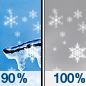 Temperature: 27°F Wind Speed: 12 to 18 mph Wind Direction: NW Forecast: Snow. Mostly cloudy, with a low around 27. Northwest wind 12 to 18 mph, with gusts as high as 33 mph. Chance of precipitation is 80%. New snow accumulation of less than one inch possible. |