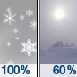 Temperature: -8°F Wind Speed: 5 to 10 mph Wind Direction: S Forecast: Snow after 2am. Mostly cloudy. Low around -8, with temperatures rising to around 0 overnight. South wind 5 to 10 mph. Chance of precipitation is 80%. New snow accumulation of less than half an inch possible. |