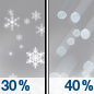 Temperature: 39°F Wind Speed: 6 mph Wind Direction: NE Forecast: A chance of snow between 7am and 3pm, then a chance of snow and a slight chance of sleet. Mostly cloudy, with a high near 39. Chance of precipitation is 40%. |