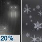 Temperature: 20°F Wind Speed: 0 to 5 mph Wind Direction: N Forecast: Mostly cloudy, with a low around 20. North wind 0 to 5 mph. |