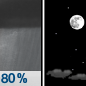 Temperature: 72°F Wind Speed: 10 to 15 mph Wind Direction: WNW Forecast: A slight chance of rain showers before 7am, then showers and thunderstorms. Mostly cloudy, with a high near 72. West northwest wind 10 to 15 mph, with gusts as high as 30 mph. Chance of precipitation is 80%. |