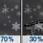 Temperature: 14°F Wind Speed: 10 mph Wind Direction: SSW Forecast: Snow likely before 3am, then a chance of snow and a chance of freezing rain. Mostly cloudy, with a low around 14. South southwest wind around 10 mph, with gusts as high as 18 mph. Chance of precipitation is 70%. New snow accumulation of less than half an inch possible. Little or no ice accumulation expected. |