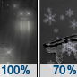 Temperature: 35°F Wind Speed: 9 to 13 mph Wind Direction: N Forecast: A chance of snow. Mostly cloudy, with a high near 35. Chance of precipitation is 40%. |