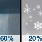 Temperature: 34°F Wind Speed: 10 to 15 mph Wind Direction: S Forecast: A chance of rain showers after midnight. Cloudy, with a low around 34. |