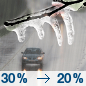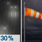 Temperature: 30°F Wind Speed: 10 to 15 mph Wind Direction: SW Forecast: A chance of rain. Cloudy, with a low around 30. Chance of precipitation is 30%. |