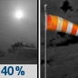 Temperature: 40°F Wind Speed: 14 mph Wind Direction: SW Forecast: A chance of rain. Cloudy, with a low around 40. |