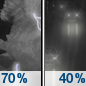Temperature: 50°F Wind Speed: 8 mph Wind Direction: S Forecast: Showers and thunderstorms likely before 11pm, then a chance of rain. Mostly cloudy, with a low around 50. |