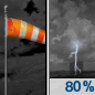 Temperature: 48°F Wind Speed: 13 to 22 mph Wind Direction: NW Forecast: A chance of showers and thunderstorms between midnight and 1am, then showers and thunderstorms. Mostly cloudy. Low around 48, with temperatures rising to around 56 overnight. Northwest wind 13 to 22 mph, with gusts as high as 37 mph. Chance of precipitation is 80%. New rainfall amounts between a tenth and quarter of an inch possible. |