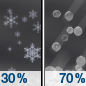 Temperature: 27°F Wind Speed: 5 to 10 mph Wind Direction: NE Forecast: A chance of snow between 8pm and 2am, then snow likely and a slight chance of sleet. Mostly cloudy, with a low around 27. Northeast wind 5 to 10 mph, with gusts as high as 25 mph. Chance of precipitation is 70%. New snow accumulation of 1 to 3 inches possible. |