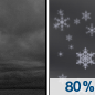 Temperature: 23°F Wind Speed: 6 to 9 mph Wind Direction: SW Forecast: Snow showers. Mostly cloudy, with a low around 23. Southwest wind 6 to 9 mph. Chance of precipitation is 80%. New snow accumulation of less than half an inch possible. |