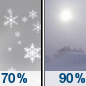 Temperature: 14°F Wind Speed: 7 to 17 mph Wind Direction: W Forecast: Snow showers likely before 1am. Mostly cloudy, with a low around 14. West wind 7 to 17 mph. Chance of precipitation is 60%. New snow accumulation of 1 to 3 inches possible. |