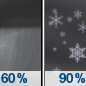 Temperature: 36°F Wind Speed: 10 to 15 mph Wind Direction: S Forecast: Rain showers likely before 5am, then rain and snow showers. Mostly cloudy, with a low around 36. |