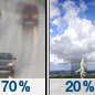 Temperature: 69°F Wind Speed: 12 to 16 mph Wind Direction: SW Forecast: Rain likely before 5pm, then a slight chance of thunderstorms and a slight chance of rain. Mostly sunny, with a high near 69. Chance of precipitation is 70%. |