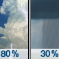 Temperature: 50°F Wind Speed: 5 mph Wind Direction: SW Forecast: Showers and thunderstorms. Mostly cloudy, with a low around 50. Southwest wind around 5 mph. Chance of precipitation is 80%. |