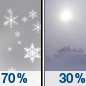 Temperature: 34°F Wind Speed: 3 to 7 mph Wind Direction: W Forecast: A chance of snow. Partly sunny, with a high near 34. Chance of precipitation is 30%. |