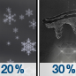 Temperature: 22°F Wind Speed: 3 mph Wind Direction: SW Forecast: A chance of snow showers before 1am. Mostly cloudy, with a low around 22. |