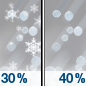 Temperature: 29°F Wind Speed: 0 to 5 mph Wind Direction: E Forecast: A chance of snow before 8pm, then a chance of snow and a chance of sleet between 8pm and 10pm, then a chance of sleet and rain and snow likely between 10pm and 5am, then freezing rain likely. Cloudy, with a low around 29. Chance of precipitation is 60%. New snow accumulation of less than half an inch possible. Little or no ice accumulation expected. |