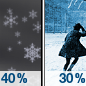 Temperature: 4°F Wind Speed: 2 to 6 mph Wind Direction: W Forecast: A slight chance of snow showers before 7pm. Mostly cloudy, with a low around 4. West wind 2 to 6 mph. Chance of precipitation is 40%. |