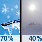 Temperature: 38°F Wind Speed: 14 to 18 mph Wind Direction: SW Forecast: Snow likely and freezing rain likely before noon, then a chance of rain and snow between noon and 1pm, then patchy blowing snow and a chance of rain and snow. Mostly cloudy, with a high near 38. Southwest wind 14 to 18 mph, with gusts as high as 28 mph. Chance of precipitation is 70%. New snow accumulation of less than half an inch possible. Little or no ice accumulation expected. |