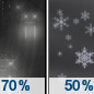 Temperature: 46°F Wind Speed: 10 to 15 mph Wind Direction: SSW Forecast: Rain likely. Cloudy, with a low around 46. Chance of precipitation is 70%. |