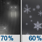 Temperature: 31°F Wind Speed: 12 mph Wind Direction: SW Forecast: Rain likely before 5am, then rain and snow likely. Mostly cloudy, with a low around 31. Chance of precipitation is 70%. |