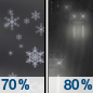 Temperature: 18°F Wind Speed: 0 to 5 mph Wind Direction: SW Forecast: A chance of snow after midnight. Mostly cloudy, with a low around 18. Southwest wind 0 to 5 mph. Chance of precipitation is 30%. |