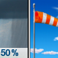 Temperature: 50°F Wind Speed: 13 to 17 mph Wind Direction: S Forecast: Mostly cloudy, with a low around 50. |