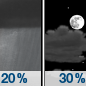 Temperature: 45°F Wind Speed: 13 mph Wind Direction: W Forecast: A chance of rain showers. Partly cloudy, with a low around 45. West wind around 13 mph. Chance of precipitation is 30%. |
