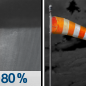 Temperature: 24°F Wind Speed: 15 to 25 mph Wind Direction: W Forecast: Rain showers before 11pm. Mostly cloudy, with a low around 24. West wind 15 to 25 mph, with gusts as high as 55 mph. Chance of precipitation is 80%. New rainfall amounts between a half and three quarters of an inch possible. |
