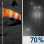 Temperature: 33°F Wind Speed: 10 to 24 mph Wind Direction: S Forecast: A slight chance of rain showers between midnight and 1am, then areas of fog and a chance of rain showers between 1am and 3am, then rain likely and areas of fog. Mostly cloudy, with a low around 33. Chance of precipitation is 70%. |