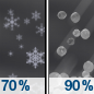 Temperature: 32°F Wind Speed: 5 mph Wind Direction: E Forecast: Rain likely. Cloudy, with a low around 32. Chance of precipitation is 70%. |