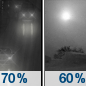 Temperature: 20°F Wind Speed: 10 to 18 mph Wind Direction: SSE Forecast: A chance of snow. Mostly cloudy, with a high near 20. South southeast wind 10 to 18 mph, with gusts as high as 29 mph. Chance of precipitation is 30%. |