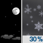Temperature: 14°F Wind Speed: 0 mph Wind Direction: Forecast: A chance of snow after 3am. Mostly clear, with a low around 14. East wind around 0 mph. Chance of precipitation is 30%. |