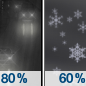 Temperature: 30°F Wind Speed: 3 to 7 mph Wind Direction: SW Forecast: Rain before 2am, then rain and snow likely. Mostly cloudy, with a low around 30. Chance of precipitation is 80%. |