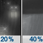 Temperature: 40°F Wind Speed: 9 mph Wind Direction: W Forecast: A slight chance of showers and thunderstorms before 7pm. Partly cloudy, with a low around 40. |