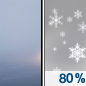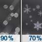 Temperature: 22°F Wind Speed: 6 to 9 mph Wind Direction: S Forecast: Snow likely after 8pm. Mostly cloudy, with a low around 22. Chance of precipitation is 70%. |