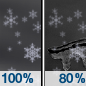 Temperature: 20°F Wind Speed: 7 mph Wind Direction: SE Forecast: Snow. Cloudy, with a low around 20. Southeast wind around 7 mph. Chance of precipitation is 100%. New snow accumulation of 4 to 8 inches possible. |