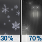 Temperature: 12°F Wind Speed: 10 to 15 mph Wind Direction: W Forecast: A chance of snow. Mostly cloudy, with a low around 12. Chance of precipitation is 30%. |