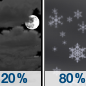 Temperature: 25°F Wind Speed: 7 mph Wind Direction: SW Forecast: Snow likely after midnight. Mostly cloudy, with a low around 25. Southwest wind around 7 mph. Chance of precipitation is 80%. New snow accumulation of less than one inch possible. |