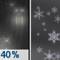 Temperature: 37°F Wind Speed: 7 to 12 mph Wind Direction: NW Forecast: A chance of rain before midnight, then a chance of rain showers between midnight and 5am, then a chance of snow showers. Mostly cloudy, with a low around 37. Northwest wind 7 to 12 mph. Chance of precipitation is 40%. |