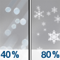 Temperature: 24°F Wind Speed: 5 to 10 mph Wind Direction: N Forecast: Snow likely before 9pm. Mostly cloudy, with a low around 24. North wind 5 to 10 mph. Chance of precipitation is 60%. New snow accumulation of less than one inch possible. |
