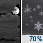 Temperature: 22°F Wind Speed: 0 to 10 mph Wind Direction: SSW Forecast: Snow likely after 2am. Mostly cloudy. Low around 22, with temperatures rising to around 25 overnight. South southwest wind 0 to 10 mph. Chance of precipitation is 70%. New snow accumulation of less than half an inch possible. |