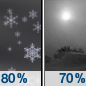 Temperature: 34°F Wind Speed: 7 to 10 mph Wind Direction: NE Forecast: Snow. Cloudy, with a high near 34. Northeast wind 7 to 10 mph. Chance of precipitation is 80%. New snow accumulation of 2 to 4 inches possible. |