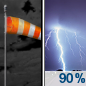 Temperature: 57°F Wind Speed: 25 to 30 mph Wind Direction: S Forecast: Isolated showers and thunderstorms between midnight and 1am, then widespread showers and thunderstorms. Mostly cloudy. Low around 57, with temperatures rising to around 63 overnight. South wind 25 to 30 mph. Chance of precipitation is 90%. New rainfall amounts between a quarter and half of an inch possible. |