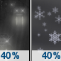 Temperature: 40°F Wind Speed: 5 mph Wind Direction: NE Forecast: A chance of snow before 10am, then rain and snow likely. Mostly cloudy, with a high near 40. Northeast wind around 5 mph. Chance of precipitation is 60%. |