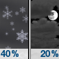Temperature: 20°F Wind Speed: 7 to 12 mph Wind Direction: SW Forecast: A chance of snow before 10pm. Mostly cloudy, with a low around 20. Southwest wind 7 to 12 mph. Chance of precipitation is 40%. New snow accumulation of 1 to 2 inches possible. |