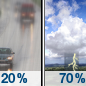 Temperature: 71°F Wind Speed: 12 mph Wind Direction: E Forecast: A slight chance of rain between 8am and 2pm, then showers and thunderstorms likely. Partly sunny, with a high near 71. East wind around 12 mph, with gusts as high as 24 mph. Chance of precipitation is 70%. New rainfall amounts between a quarter and half of an inch possible. |