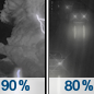 Temperature: 47°F Wind Speed: 8 to 15 mph Wind Direction: SW Forecast: Rain before 7pm, then showers and thunderstorms between 7pm and 10pm, then rain. Mostly cloudy, with a low around 47. Southwest wind 8 to 15 mph, with gusts as high as 25 mph. Chance of precipitation is 90%. New rainfall amounts between a tenth and quarter of an inch possible. |