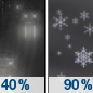 Temperature: 32°F Wind Speed: 14 to 24 mph Wind Direction: S Forecast: Rain between 8pm and 4am, then rain and snow. Cloudy. Low around 32, with temperatures rising to around 35 overnight. South wind 14 to 24 mph, with gusts as high as 40 mph. Chance of precipitation is 90%. New rainfall amounts between a tenth and quarter of an inch possible. |