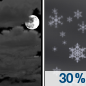 Temperature: 30°F Wind Speed: 5 to 10 mph Wind Direction: NE Forecast: A chance of snow after 4am. Mostly cloudy, with a low around 30. |